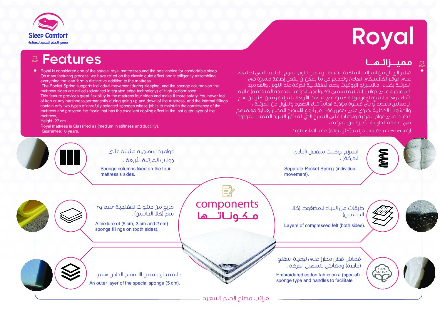 تعتبر الرويال من المراتب الملكية الخاصة ، وسفير للنوم المريح ، اعتمدنا في تصنيعها على الوقع الكلاسيكي الهادئ وتجميع كل ما يمكن ان يشكل إضافة مميزة في المرتبة بذكاء ، فالاسبرنج البوكيت يدعم استقلالية الحركة عند النوم ، والعواميد الاسفنجية على جوانب المرتبة تسمى (تكنولوجيا الحواف المدمجة المتقدمة) عالية الأداء ، وهذه الميزة توفر مرونة كبيرة في الجهات الأربعة للمرتبة وامان اكثر من عدم الإحساس بالحديد أو بأي قساوة مؤذية نهائياً اثناء الصعود والنزول من المرتبة ، والحشوات الداخلية تحتوي على نوعين فقط من أنواع الاسفنج المختار بعناية مهمتهم الحفاظ على قوام المرتبة والحفاظ على النسيج الذي له تأثير التبريد الممتاز الموجود في الطبقة الخارجية الأخيرة من المرتبة ،