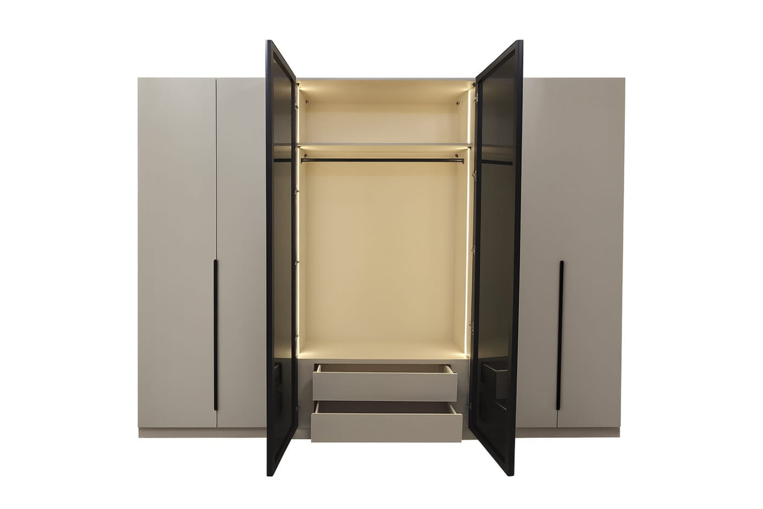 غرفة نوم سرير من قماش بوكليه وبمساحة تخزين اضافية في الدولاب